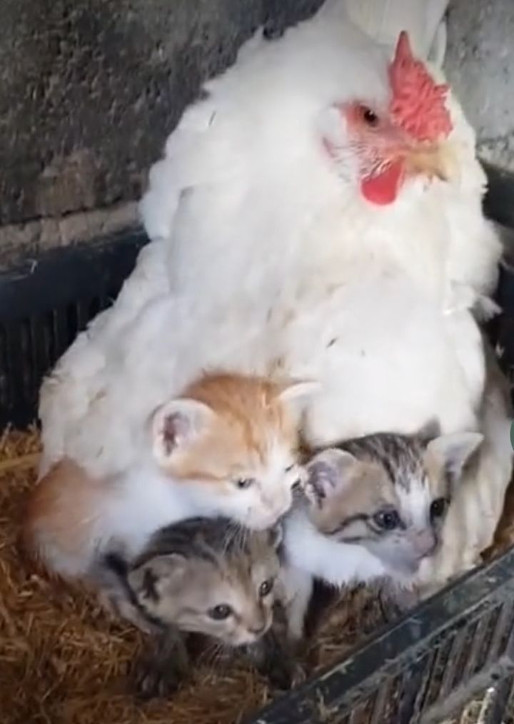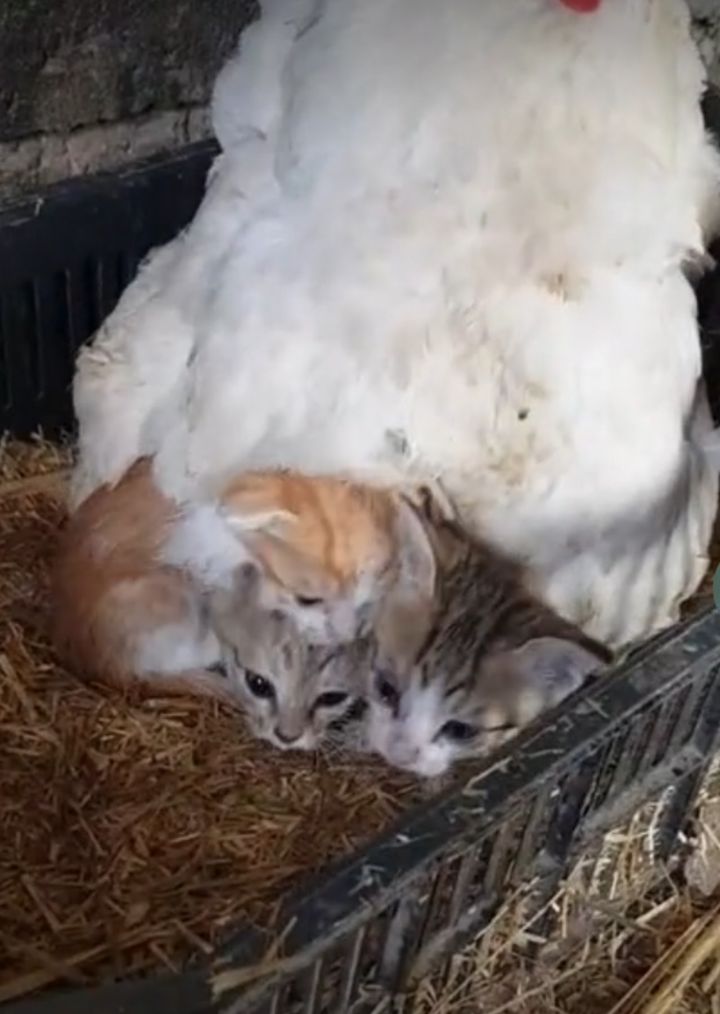 ニワトリの体の下から現れたのは、とっても可愛らしい3匹の子猫。どうやらこのニワトリは母親が見当たらない子猫たちの母親代わりとなって、自分の羽で温めてあげていたようです。