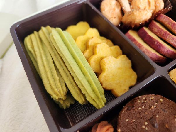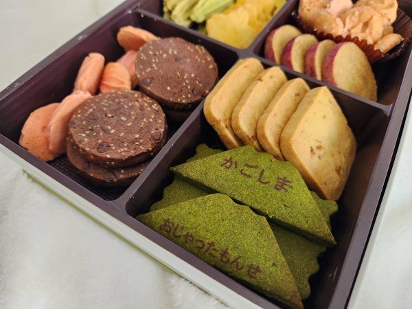 オクラパウダーが使われたクッキーはオクラの形、桜島小みかんを使用しているのは桜型に。