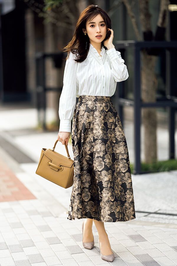シャツ¥7,920/NATURAL BEAUTY BASIC スカート¥3,990/神戸レタス イヤリング¥3,630/アネモネ(サンポークリエイト) バッグ¥55,000/ヴァジック(ヴァジックジャパン) 靴¥26,400/銀座かねまつ(銀座かねまつ6丁目本店)