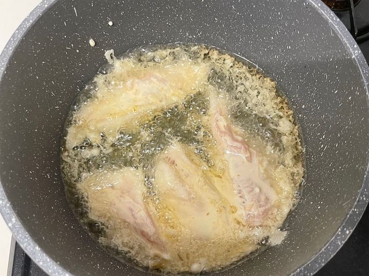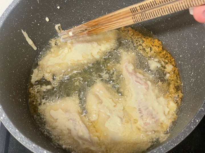 2.鶏むね肉に衣をたっぷりと付けて、170℃くらいの油でキツネ色になるまで揚げます。
