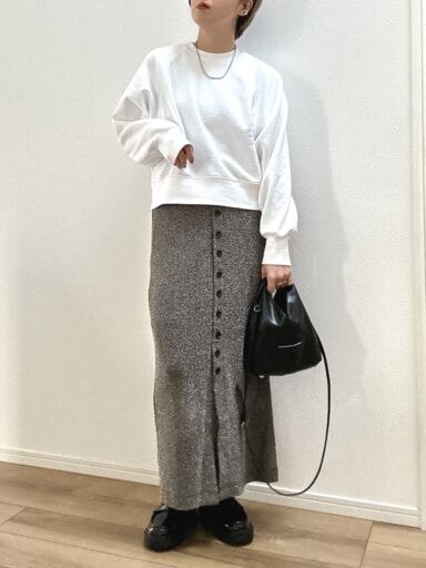 スウェットは短丈ながらも程よくゆとりある身幅で大人世代にも着やすいバランスなので、どんなシルエットのボトムとも合わせやすのが嬉しいポイント。Iラインシルエットのスカートなら、スッキリとまとまってスタイルアップ効果も狙えます。