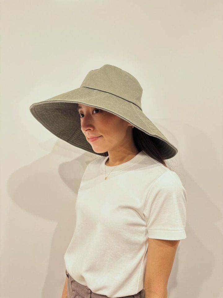 おすすめカラーは、甘めにも振れるモノトーン。ツバが長く、日除けに加え小顔効果も。