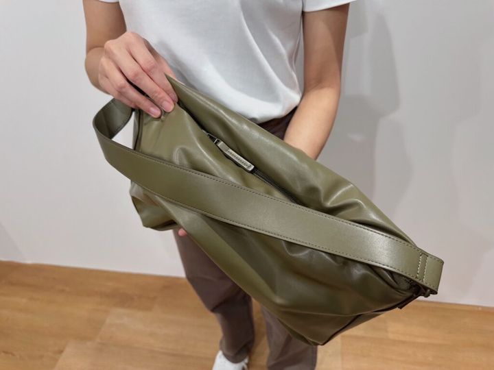まるで枕のようなふっくらとしたフォルムが可愛らしいショルダーバッグ。マチつきで、A4ファイルやノートPCがラクに入る大容量さが嬉しい。フェイクレザーの艶やかで柔らかいテクスチャーが、高級感を演出してくれます。