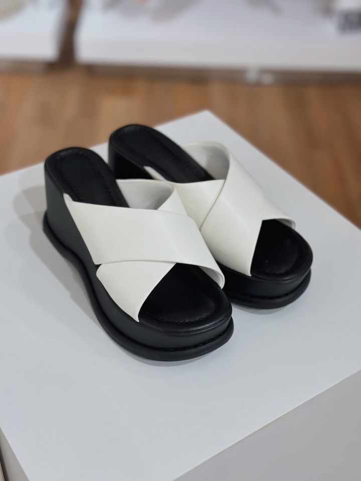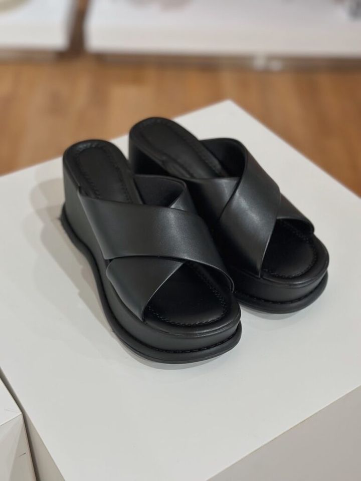 ヒールが高めで、スタイルアップが叶う1足。ウェッジソールなので、履き心地は安定しています。太めのクロスストラップが足の甲をしっかりホールドしてくれるため、長時間履いても疲れません。