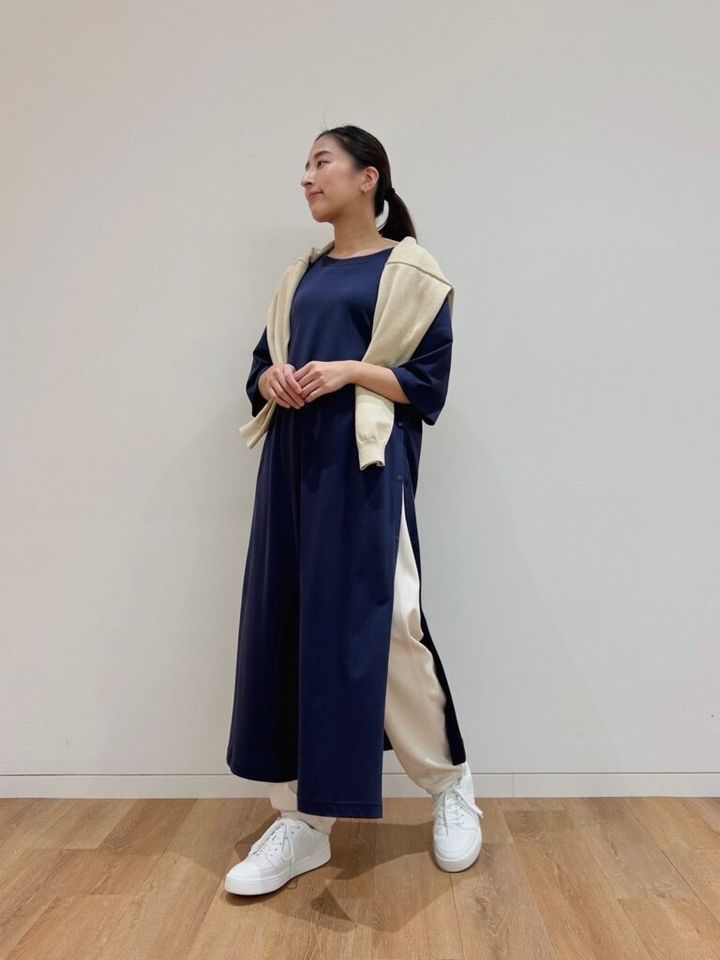 リラクシーな七部袖ワンピには、肩がけニットで洒落感をプラス。深めに開けたスリットからスウェットパンツを覗かせて、ひと手間加えた上級者の着こなしに。ネイビー×ホワイトの知的な配色なら、カジュアルアイテムでまとめてもキレイめに仕上がります。