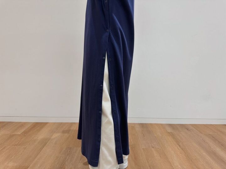マットな質感のスナップボタンは、サイドにニュアンスを加えてくれます。スリットの深さを調整できるので、1枚で着てもレイヤードしてもOK。