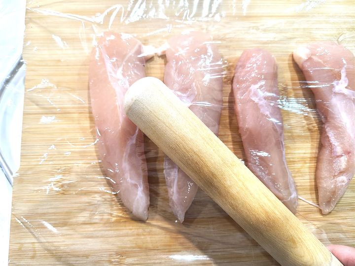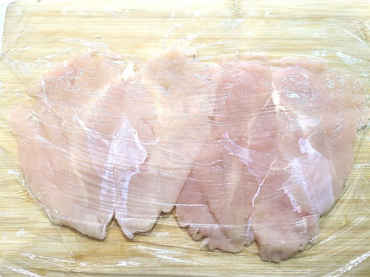 2.まな板にささみ肉を並べ、上からラップをかけめん棒などでたたき、薄くのばします。