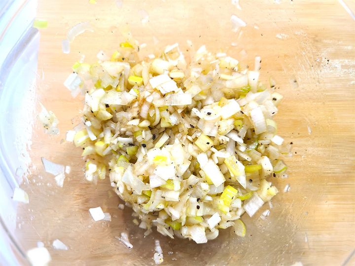 1.長ねぎをみじん切りにし、塩、うま味調味料、黒こしょう、すりおろしたにんにく、ゴマ油、しょうゆを加え、よく混ぜ合わせます。長ねぎの辛みが苦手な方は、ここで1分ほど電子レンジで加熱するといいそうですよ!