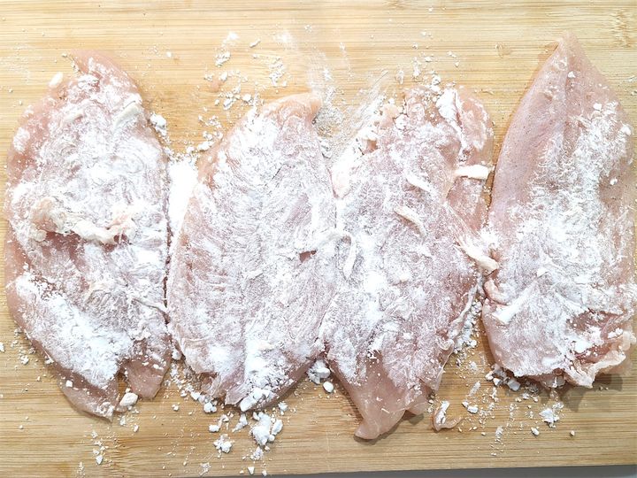 3.薄く伸ばしたささみ肉に塩、こしょうを振り、片栗粉をまぶします。