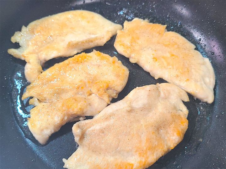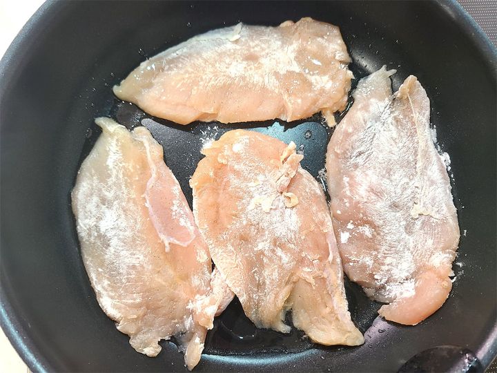 4.フライパンを強めの中火にかけ大さじ1の油(分量外)を引き、ささみ肉を焼いていきます。