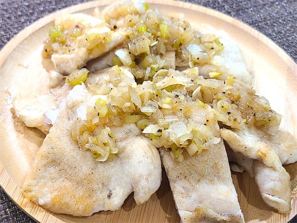 6.1のねぎダレを少しフライパンで温めて、焼いたささみ肉にかけたら完成です♪お好みでレモン汁をかけてもおいしいですよ!