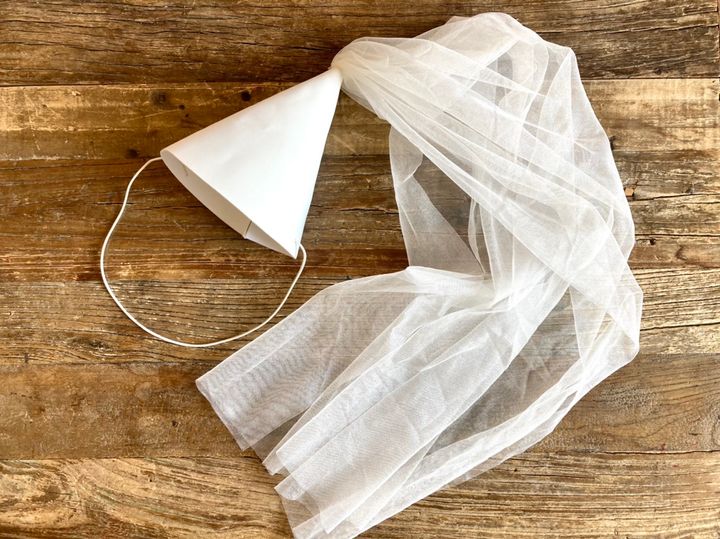 ほんのりキラキラした合皮素材の白い三角ハットに、ふんわりしたチュール素材のベールがついています。