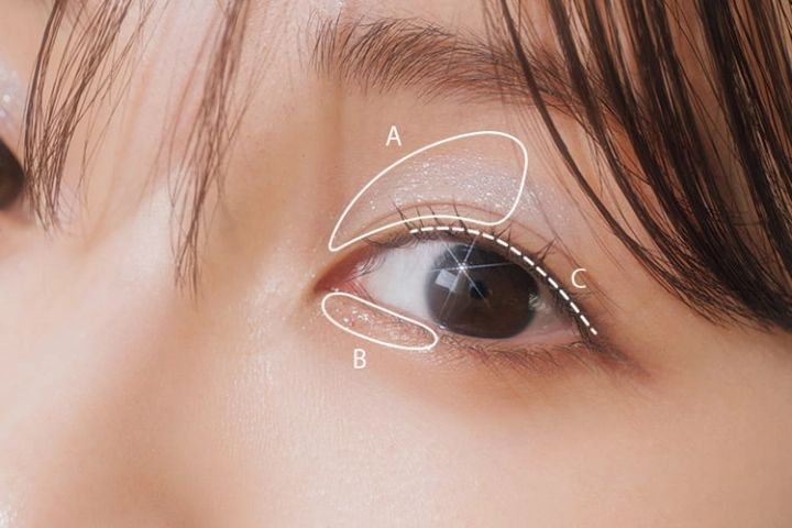 Aを目頭側1/2に眉下くらいまでタテ長に、Bは下まぶたの1/3に幅狭めにつける。目尻側をはずすことで「地のくすみ=いい感じの陰影」に利用しちゃって!まつ毛のきわはCで埋めて適度に目ヂカラをキープ。