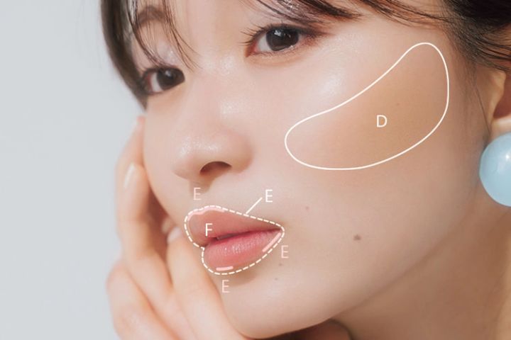 Dの下2色を混ぜたら、ブラシでほお骨のすぐ下をなぞるように斜めに引き上げる。 骨格もシャープに見せてくれる!