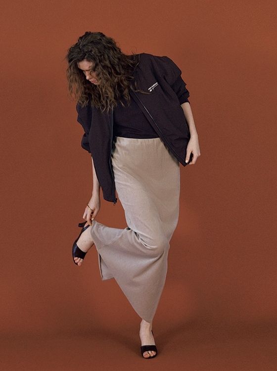 ブラウンナイロンジャケット 17,600円、中に着たブラウンリブタンク 5,500円/ともにニューバランス(ニューバランスジャパンお客様相談室) ベージュベロアスカート 15,400円/Higuchi Kaori×Spick & Span(スピック&スパン ルミネ有楽町店) バングル 49,500円/リューク サンダル 33,000円/エディット フォー ルル