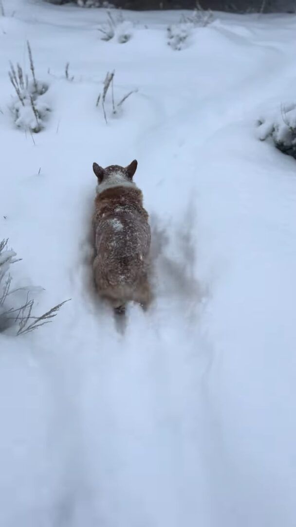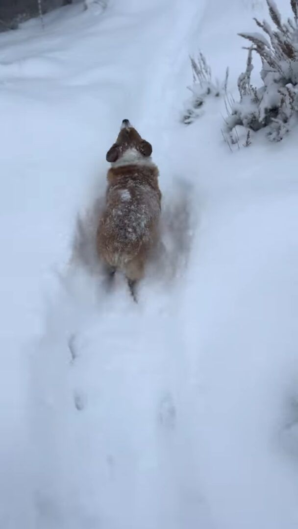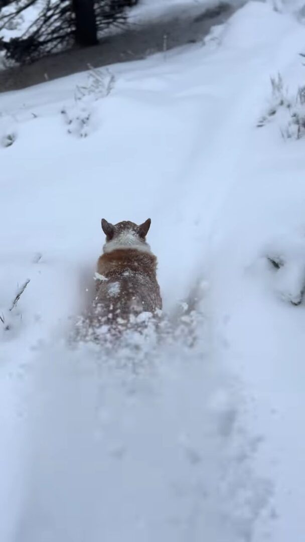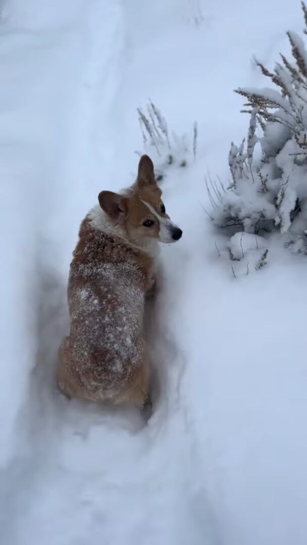 雪深い山でハイキングをしていたコーギー。 せっかくなのでこの子を雪遊びに誘ってみる撮影者さんでしたが、返ってきた反応は・・・。