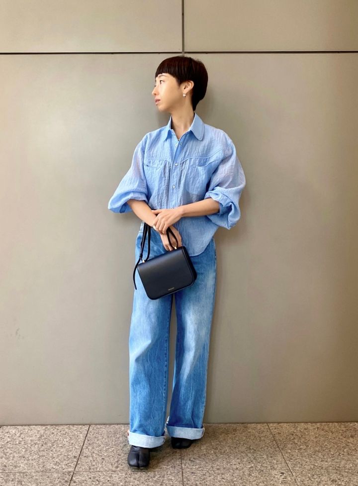 さり気ないディテールをきかせた春らしいワントーンコーデ。「シアーで今っぽい凹凸のあるリップル素材を生かしたウエスタンシャツ。デニムにもなじむブルー&柔らかい素材感でサイズ感もコンパクトなので、バランスよく着られて気に入っています」