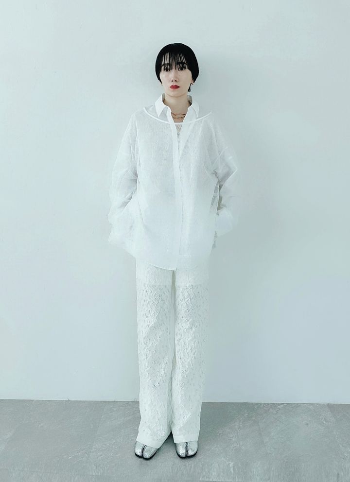 チュールブラウスを重ねて白シャツを旬顔にシフト。「白シャツはトレンドやシーズン関係なく好きなアイテム。さらりと一枚でも素敵ですが、繊細なメッシュのブラウスを上に重ねて今季らしいニュアンスをプラスしました」