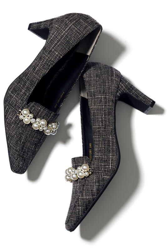 スクエアトウが上品なローファーシューズに、パールをトッピングした1足。ツイード生地を使用しているので、春のクラシカルスタイルにも最適。