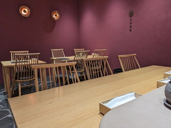 お店の中には、木のぬくもりが印象的なテーブルセットが置かれた、落ち着いた空間のイートインスペースがあり、お茶やスイーツを楽しむことができます。お茶をゆっくり楽しめるように選ばれたという、椅子とテーブルは同ビル2階の「カシワ・フクオカ」で取り揃えています。