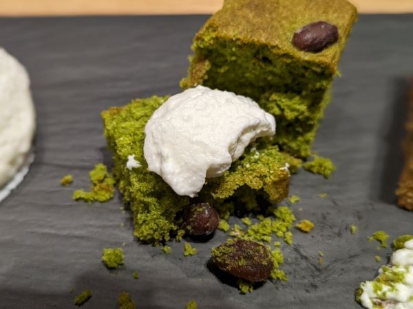 まずは「効茶」の香りを楽しみます。香ばしい香りを堪能し、一口。出会ったことのない複雑な味わい♪想像していた「健康茶」のイメージとは違い、24種のお茶がどれもぶつかり合うことなく交わって、芳醇な味に仕上がっています。長くやかんで煮だして濃いめに淹れているそうですが、えぐみが全くなく、濃い味わいながらもまろやかで、とっても飲みやすいお茶なんです。 パウンドケーキも一つ一つが、素材の味が引き立っていてお茶のお供にぴったりです。お店で毎日泡立てているという生クリームは、甘さが控えめでとっても軽いので、パウンドケーキにぴったりでした。
