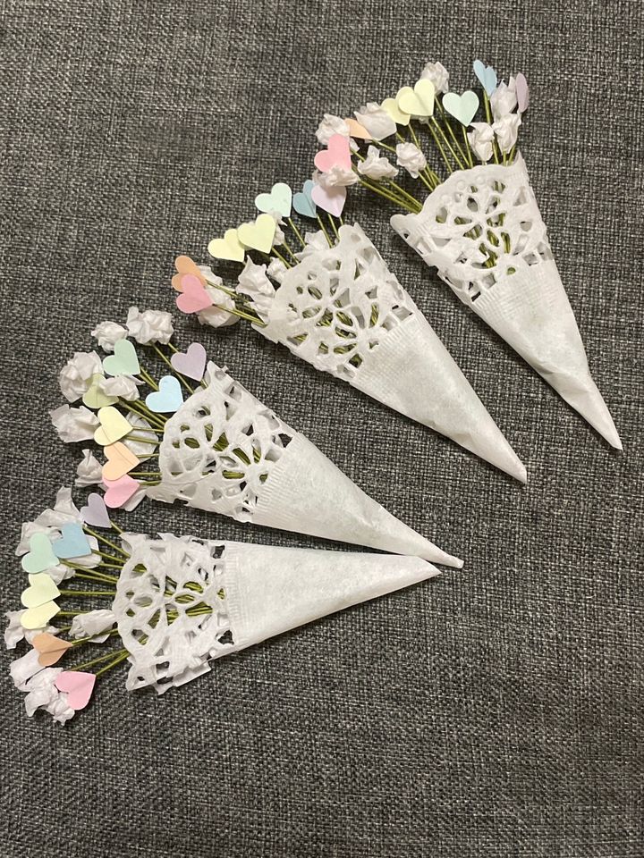 複数つくってワイヤー同士を絡めて束ね、1/4に切った小さいペーパーレースでまとめたらかわいいハートのブーケが完成です。