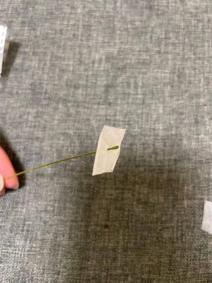 5.ワイヤーのカネダインがついていない方を1.5cm角のお花紙の大体真ん中から突き刺します
