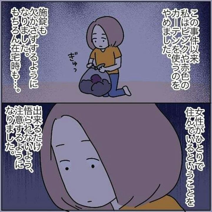 侵入者と家の中で2人きり。恐怖という言葉では片づけられないほどの危機を覚えた加藤かとさんは、その後アパートから引っ越すことにしました。心配して駆けつけた父から言われたのは、ハート柄のカーテンが外から見えたので、女性の1人暮らしだと悟られたのではということ。もちろん1人暮らしだとわかるようにした加藤さんが悪いわけではありません。しかし、犯罪者から身を守るために、女性の1人暮らしだと気付かれないようにするのは自衛方法の一つです。