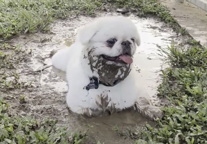 2. なぜそこで休憩しちゃうのー! お散歩に疲れた犬、泥水の中でひと休み♪