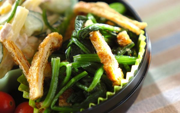 ショウガを効かせた大人好みの和え物はいかがでしょうか。油揚げはフライパンで焼いてカリッとさせておくと食感を楽しめるうえ、香ばしさもアップ。味付けはしょうゆだけとシンプルなので、主菜を選ばないのも魅力です。