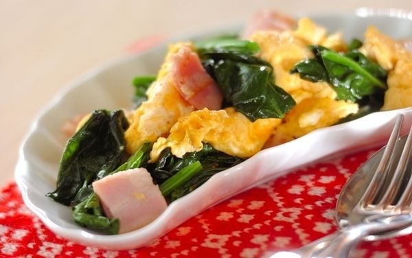 ホウレン草とベーコンを炒めてスクランブルエッグと混ぜ合わせると、色合いも栄養バランスも抜群の副菜に。ベーコンの脂がホウレン草にからんでコク深い味わいに仕上がります。食感を活かすよう、サッと炒めてくださいね。