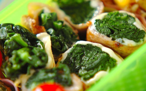 豚バラ肉にスライスチーズとホウレン草をのせてくるくる巻くと、副菜の完成。崩れないように、きつめに巻くのがポイントです。巻き終わりを下にしてフライパンに並べたら、全体にしっかり火を通しましょう。断面がキレイでお弁当がパッと華やかになりますよ。