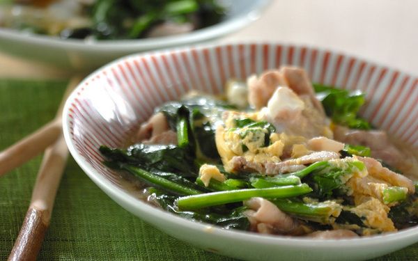 旨みの強い豚バラ肉とホウレン草を卵でとじると、やさしい味わいにホッとしますよ。豚バラ肉はアクが出るため、アクを取ってからホウレン草を加えましょう。卵は半熟にするのがおすすめ。一味唐辛子を振るとお酒に合う味わいにアレンジできますよ。