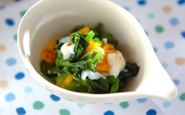 トロッと口当たりの良い温泉卵にホウレン草をからめながらいただく副菜。ホウレン草にセリを混ぜるため、食感も香りも豊かです。しょうゆ以外にもだししょうゆやめんつゆをかけるアレンジもおすすめ。