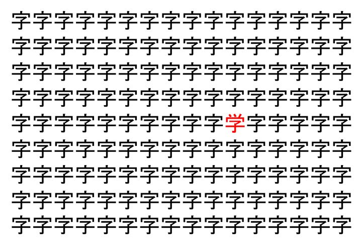 画像の中には、「字」という漢字が縦に9行、横に16個並んでいます。 全部で144個となりますが・・・、そのうち1つは「異なる漢字」となってますよ!!