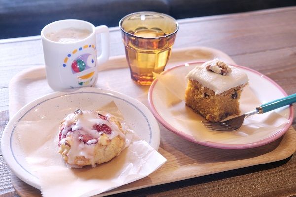 見るからに美味しそうな焼菓子、どれも食べてみたくなります! 5~6種類あるラインナップは日によって変わるそうで、アップルパイなどのパイもあるそう。1個でお腹いっぱいになるだろうなと思いながらも、1つに決めきれなくて(汗)、キャロットケーキと、期間限定のいちごクリームチーズスコーンをいただくことに。ドリンクは、ホットコーヒーに、+50円でミルクを追加してもらいました。