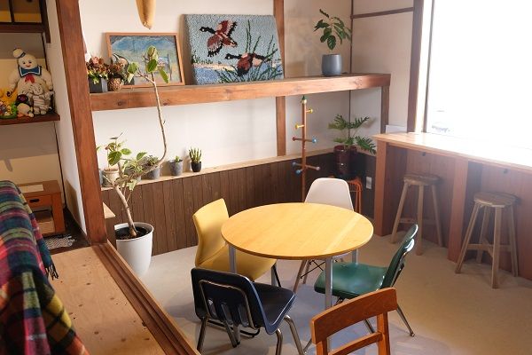 奥のフロアには、ソファが置かれたテーブル席が2つ。手前のフロアにテーブル席2つと、窓際にカウンター席。どれも違うデザインのテーブルや椅子が置かれていて、どこの席に座ろう…とワクワクします。床の間や引き戸など、和風な要素もありながら、カラフルなインテリアや、キャラクターの玩具など遊び心のある要素が組み合わさって、何ともお洒落な空間です。