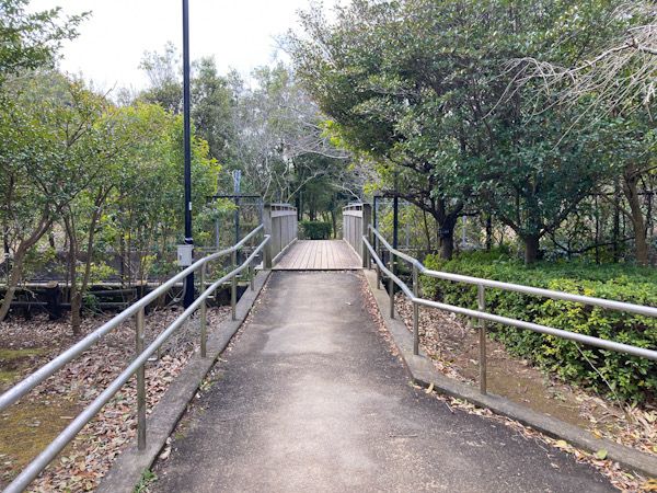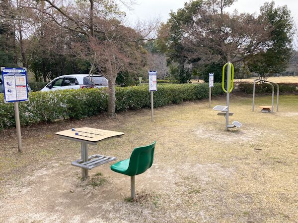 橋を越えた南側のエリアにも、健康遊具が複数あります。(写真では木に隠れてしまい一つしか見えていません…。汗)