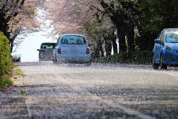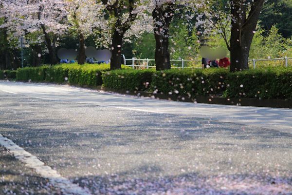 撮影時は葉桜も見え始める散り際ですが、写真から分かるように、桜吹雪がすごい! 樹から散り舞う花びらはもちろん、地面の花びらも車が通るたびに風で舞い上がるので、圧倒的迫力です。