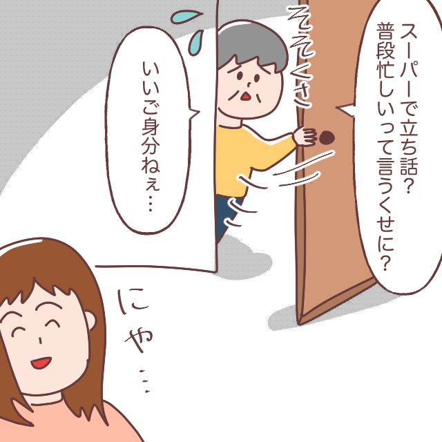 「スーパーで立ち話?普段忙しいって言うくせに?言いご身分ねぇ・・」