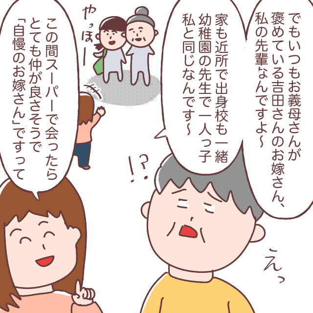 「でも、いつもお義母さんが褒めている吉田さんのお嫁さん、私の先輩なんですよ~。家も近所で出身校も一緒、幼稚園の先生で一人っ子・・私と同じなんです~」