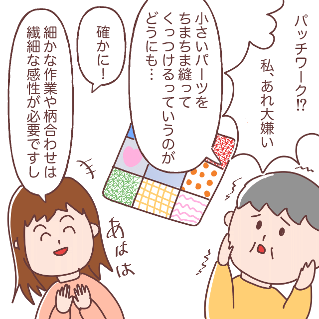「パッチワーク!?私、あれ大嫌い!小さいパーツをちまちま縫ってくっつけるっていうのがどうにも・・」