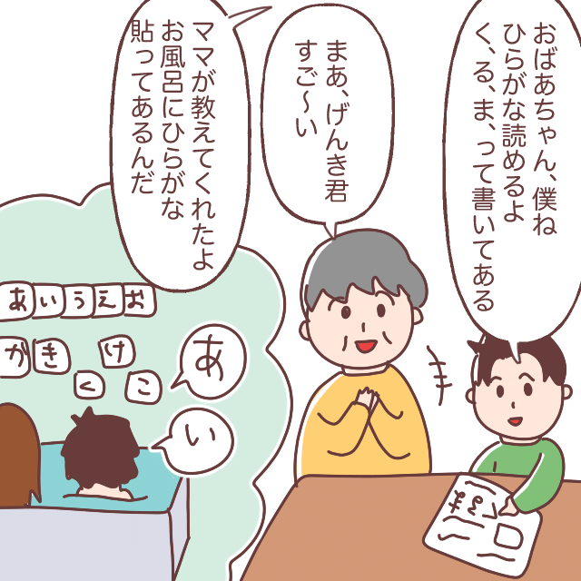 「ママが教えてくれたよ。お風呂にひらがな貼ってあるんだ」