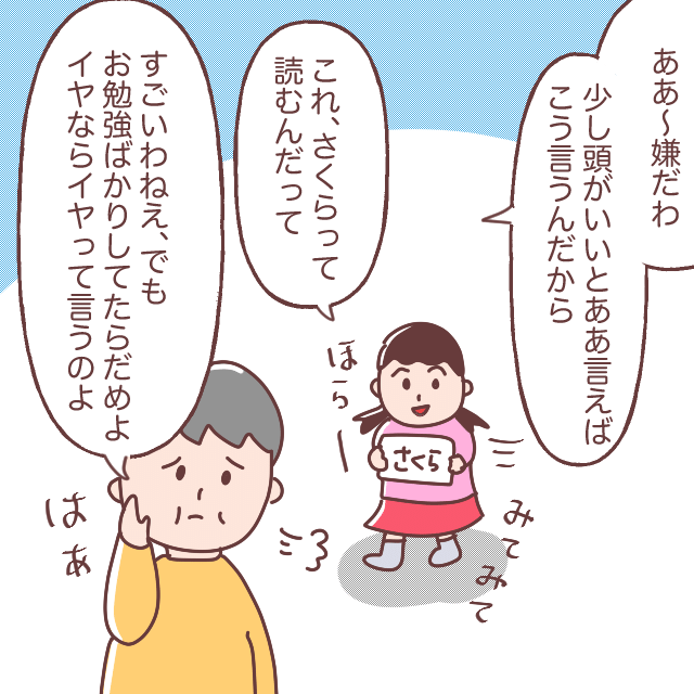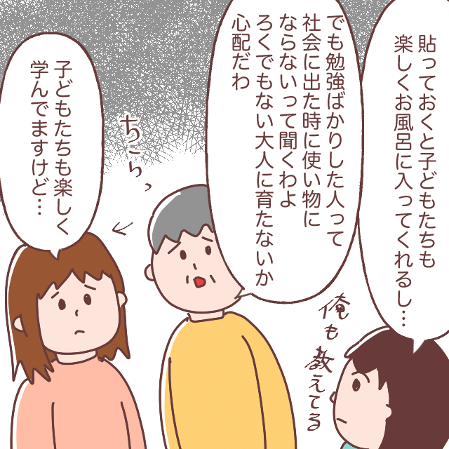 「みほさん、進学校出身だからって、小さいうちから子どもを勉強漬けにするとかわいそうよ。お風呂にひらがな表を貼ってるんでしょ?覚えろってことでしょ?」