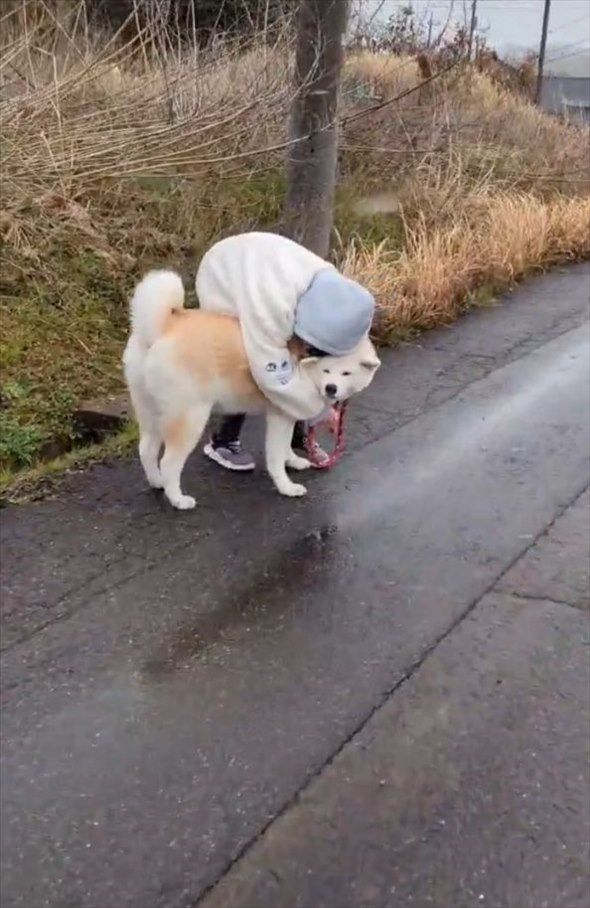 よほど寒かったのか、散歩中の愛犬に抱きついている娘さん。