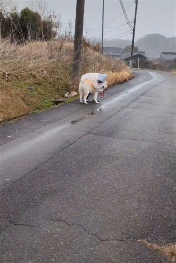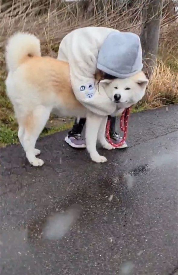 3. 寒すぎて散歩中の愛犬で暖を取る女の子。そんなふたりの姿に「かわいすぎる」「犬もうれしそう」