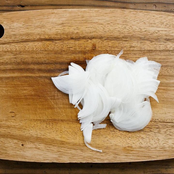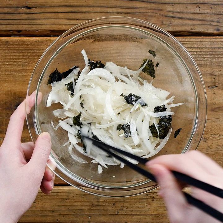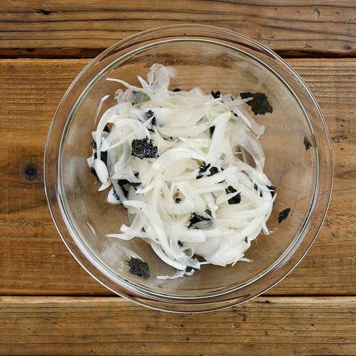 1: 新玉ねぎをスライスし、10分ほど冷水にさらしてからしっかりと水気を切っておきます。