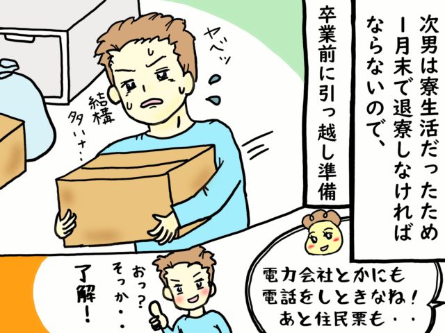 寮生活だったよんの助さんは1月で退寮しなければならなかったため、卒業前に引越し準備。