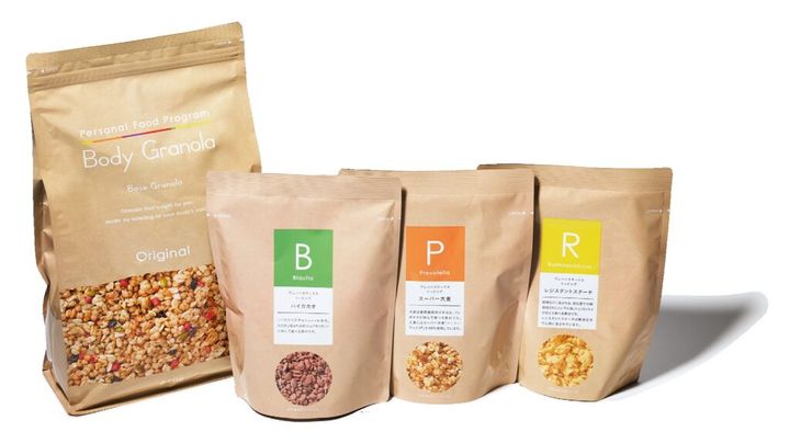 検査キット(¥10,780)で腸内フローラタイプを調べ、自分の腸内細菌が好むトッピング素材を3種選択。自分に合ったグラノーラが完成。20食分(ベースグラノーラ640g、プレバイオティクストッピング120g×3種)月額¥3,780※送料別(カルビー )