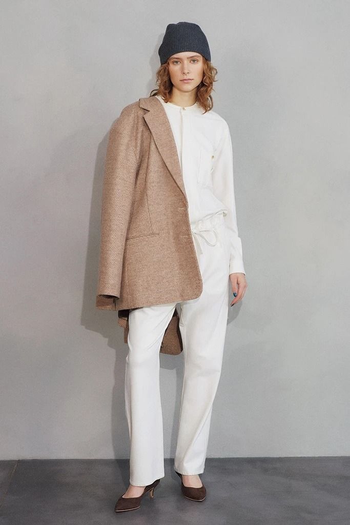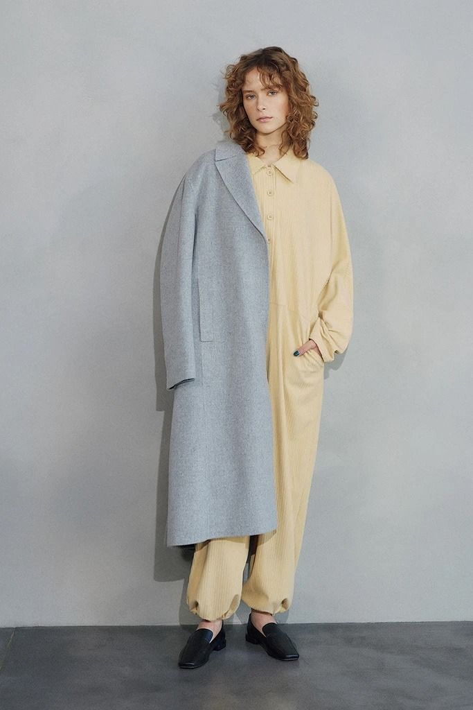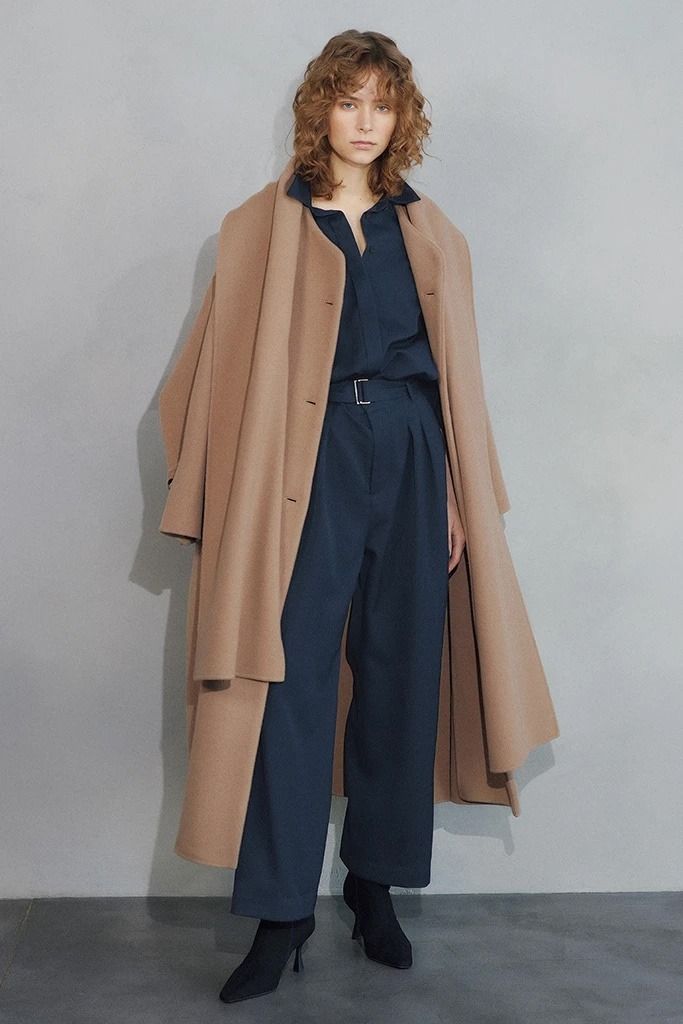 カシミヤのような風合いのノーカラーに、ワークディテールを落とし込むことでキレイとハンサムを両立。ベルトいらずなゴム仕様のウエストは、ブラウジングしたアレンジも可能。